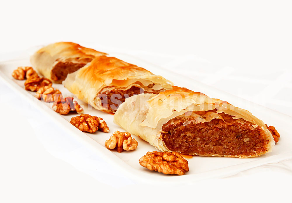 Vajon megdinszteljük a darált diót, hozzáadjuk a lecsepegtetett reszelt almát, a vaníliás cukorral, és a fűszerekkel beízesítjük, azután felöntjük tejjel, krémesre főzzünk, majd hagyjuk kihűlni. A réteslapot szétterítjük, búzadarával megszórjuk, hogy ne áztassa el a tésztát a töltelék. A rétestészta egyik szélére terítjük a tölteléket, és óvatosan feltekerjük. Kiolajozott tepsibe tesszük, és 180 °C- on, 20-25 perc alatt megsütjük. Hagyjuk kihűlni, majd egyenlő szeletekre vágjuk. Ízlés szerint, porcukorral meghintve is kínálhatjuk.