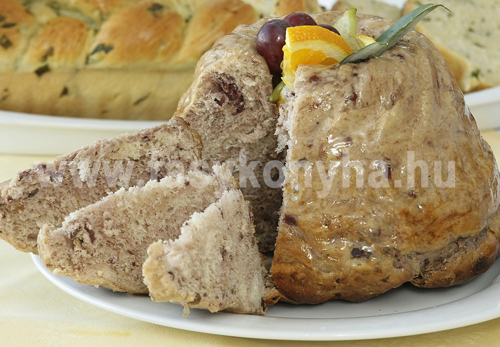 Dagasztógépbe rakjuk a lisztet, belemorzsoljuk az élesztőt, hozzáadjuk a langyos tejet, az olajat, a cukrokat, a tojást és a szódabikarbónát. Addig dagasztjuk, míg hólyagos nem lesz. A gépben 30 percig pihentetjük, majd újra összedolgozzuk. Egy tálat kilisztezünk, a tésztát belerakjuk és meleg helyre tesszük, kb.1 óráig állni hagyjuk, amíg kétszeresére megkel. A tésztát lisztezett deszkára rakjuk, gyújtófával elterítjük, megszórjuk mazsolával, dióval és a lecsepegtetett meggyel, majd óvatosan átgyúrjuk. 3 egyenlő részre osztjuk, lisztes kézzel csíkokra pederjük és hármas fonással megfonjuk. Vajjal kikent kuglóformába tesszük, melynek a közepe lyukas és felvert tojással megkenjük. 150 °C-os előmelegített sütőben kb. 40 perc alatt szép barnára sütjük.