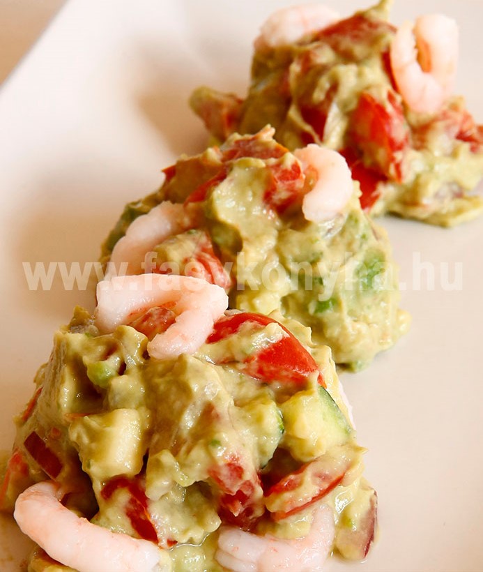 Az avokádót kimagozzuk, feldaraboljuk, tejföllel együtt krémesre turmixoljuk, sóval, citromlével ízesítjük, majd összekeverjük a vajban párolt, apróra vágott lilahagymával, cukkinivel, a friss paradicsommal, és a garnélákkal. Kupacokban ízlésesen tálaljuk.