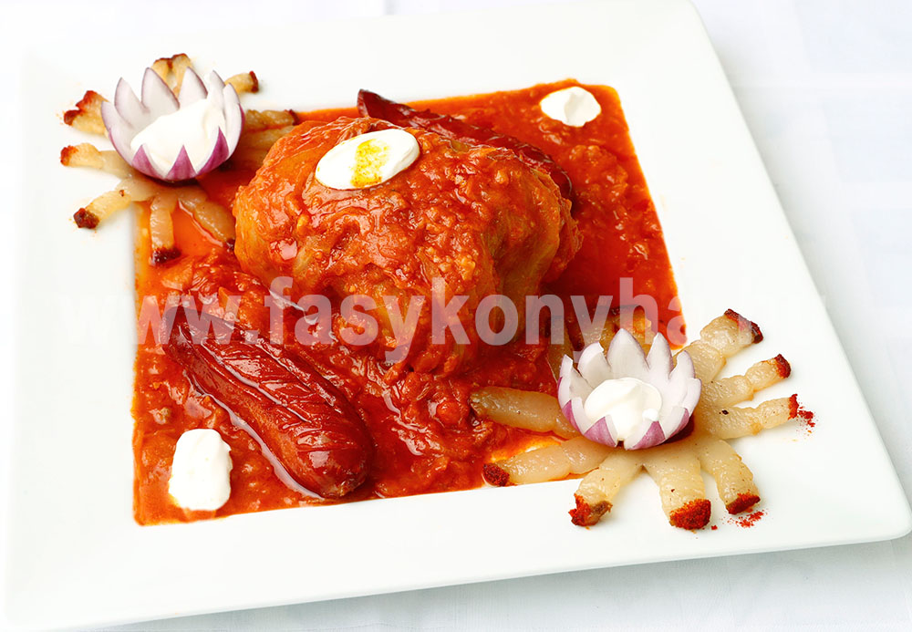 A töltelékhez a bőrös libamellet a hagymával, a péppé zúzott fokhagymával, a finomra vágott petrezselyemmel és kaporral együtt ledaráljuk, összegyúrjuk az előfőzött gerslivel, sóval, őröl borssal, őrölt köménnyel fűszerezzük. A savanyúkáposzta-levelek torzsáját levágjuk, hogy könnyen hajlíthatók legyenek. A levél keskenyebb végére helyezzük a tölteléket, az egyik felét ráhajtjuk, majd a másik felét feltekerjük és a mutatóujjunk segítségével benyomkodjuk. Nagy tölteléket készítünk. Egy lábasba belerakjuk a zsírt, megszórjuk pirospaprikával, rátesszük a savanyú aprókáposzta felét, majd a töltelékeket, azután a savanyú aprókáposzta másik felével letakarjuk. Felöntjük annyi vízzel, hogy ellepje. 2-3 órán át lassú lángon főzzük. A folyadékot folyamatosan pótoljuk. Amikor kész, leszedjük a tetejéről az aprókáposztát, kiszedjük a töltelékeket. A felszeletelt szalonnát bevagdaljuk és megsütjük a hosszában kettévágott, bekockázott debreceni kolbásszal együtt. Tálalásnál aprókáposztára helyezzük a tölteléket, majd szalonnával és kolbásszal díszítve, tejföllel meglocsolva tálaljuk