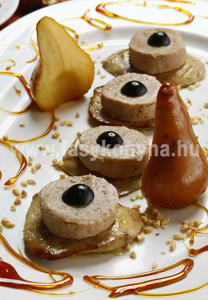 A libamellet forró olajban megforgatjuk, vízzel felöntjük, hozzáadjuk a zöldségeket, sóval, borssal ízesítjük, majd lassú tűzön puhára főzzük. A zöldségekkel együtt a húst apróra vágjuk, azután turmixgépbe rakjuk, egy tojást ütünk rá és krémesítjük, majd prézlivel összegyúrjuk, fánkszaggatóval kiszaggatjuk. 180 °C-os előmelegített sütőben rövid idő alatt készre sütjük. A libamájszeleteket lisztben megforgatjuk, lassú tűzön olajban mindkét oldalát óvatosan megsütjük. A libahústallért a libamájszeletekre helyezzük, karamellizált körtével, folyékony cukorral, pirított mandulával és félbevágott szőlőszemekkel esztétikusan díszítve tálaljuk.